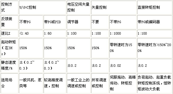 控制方式是決定變頻器使用性能的關(guān)鍵所在。目前市場上低壓通用變頻器品牌很多,包括歐、美、日及國產(chǎn)的共約50多種。選用變頻器時不要認為檔次越高越好,而要按負載的特性,以滿足使用要求為準,以便做到量才使用、經(jīng)濟實惠。表1中所列參數(shù)供選用時參考。