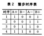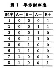 步進電機有兩種工作方式:整步方式和半步方式。以步進角1.8°四相混合式步進電機為例,在整步方式下,步進電機每接收一個脈沖,旋轉(zhuǎn)1.8°,旋轉(zhuǎn)一周,則需要2OO個脈沖。在半步方式下,步進電機每接收一個脈沖,旋轉(zhuǎn)0.9°,旋轉(zhuǎn)一周,則需要4OO個脈沖。控制步進電機旋轉(zhuǎn)必須按一定時序?qū)Σ竭M電機引線輸入脈沖。以上述四相六線制電進電機為例,其半步工作方式和整步工作方式的控制時序如表1和表2所列。