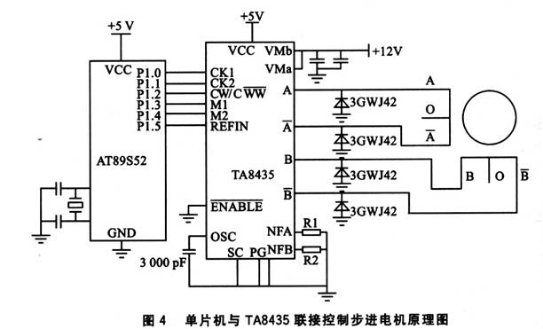 圖4是單片機與TA8435相連控制步進電機的原理圖。引腳M1和M2決定電機的轉(zhuǎn)動方式:MI=0、M2=O,電機按整步方式運轉(zhuǎn);Ml=1、M2=0,電機按半步方式運轉(zhuǎn);M1=O、M2=1,電機按1/4細分方式運轉(zhuǎn);Ml=1、M2=1,電機按l/8步細分方式運轉(zhuǎn)。CW/CWW控制電機轉(zhuǎn)動方向,CKl、CK2時鐘輸入的最大頻率不能超過5 kHz?刂茣r鐘的頻率,即可控制電機轉(zhuǎn)動速率。REFIN為高電平時,NFA和NFB的輸出電壓為0.8 V,REFIN為低電平時,NFA和NFB輸出電壓為0.5 V,這2個引腳控制步進電機輸入電流,電流大小與NF端外接電阻關系式為:,Io=Vref/Rnf。圖4中,設REFIN=l,選用步進電機額定電流為0.4 A,Rl、R2選用1.6 Ω、2W的大功率電阻,O、C兩線不接。步進電機按二相雙極性使用,四相按二相使用時可以提高步進電機的輸出轉(zhuǎn)矩。D1~D4快恢復二極管用來泄放繞組電流。