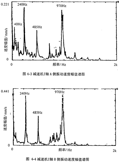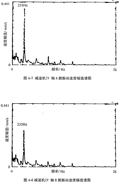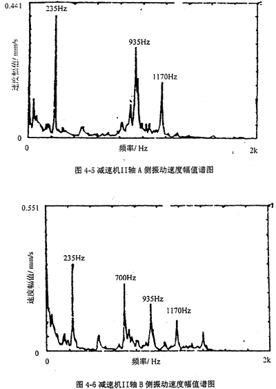圖4-3、4-4分別是把振動(dòng)加速度計(jì)放在減速機(jī)I軸A側(cè)和B側(cè)軸承座上所測(cè)得振動(dòng)速度幅值譜圖;圖4-5、4-6分別是把振動(dòng)加速度計(jì)放在減速機(jī)II軸A側(cè)和III軸B側(cè)軸承座上所測(cè)得振動(dòng)速度幅值譜圖;圖4-7、4-8分別是把振動(dòng)加速度計(jì)放在減速機(jī)IV軸A側(cè)和B側(cè)軸承座上所測(cè)得振動(dòng)速度幅值譜圖。