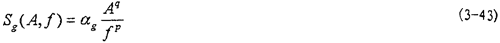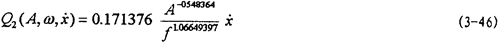 對(duì)于(3-22)模型,我們用阻尼耗能的能量關(guān)系來(lái)辨識(shí)阻尼力與振幅和頻率的關(guān)系。在前面,遲滯回線面積(即阻尼耗能)與振幅的函數(shù)關(guān)系已建立起來(lái),見(3-38)式,而且式中參數(shù)也已辨識(shí)出。同樣,用數(shù)值積分,可以算出振幅一定,頻率變化時(shí)遲滯回線的面積,由此得出遲滯回線面積與頻率的對(duì)應(yīng)關(guān)系,將這些對(duì)應(yīng)關(guān)系畫成曲線如圖3-6中大圓點(diǎn)曲線所示。由遲滯回線面積隨頻率變化的規(guī)律分析,可建立其函數(shù)關(guān)系為: