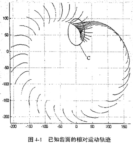 在已知齒輪齒面一個(gè)周期的相對(duì)運(yùn)動(dòng)所留下的運(yùn)動(dòng)軌跡中,我們可以看出,在區(qū)域C中出現(xiàn)了一個(gè)清晰的包絡(luò)面,它就是所求的未知齒面,即兩齒面在C區(qū)嚙合,稱C區(qū)為嚙合區(qū),而在C區(qū)之外,也會(huì)出現(xiàn)包絡(luò),但那只是幾何意義上的共軛點(diǎn),不產(chǎn)生真正意義上的嚙合傳動(dòng);已知齒面在嚙合區(qū)域與非嚙合區(qū)域有較清晰的界限;在嚙合區(qū)域,已知曲面與所求齒面的共軛關(guān)系是簡單的,無論是否會(huì)出現(xiàn)二次接觸,這一區(qū)域的共軛曲面都可以用數(shù)字化共軛曲面求解方法求出。