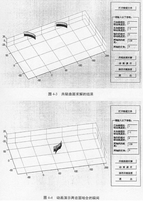 應(yīng)用共軛曲面求解軟件Conjugater1.0求得的齒輪齒面嚙合過程和結(jié)果可以用圖4-2、圖4-3和圖4-4表示。