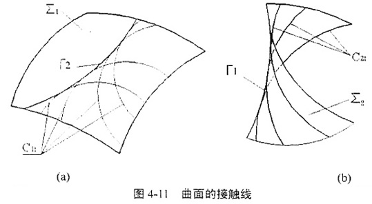 無論是已知曲面上的C1t還是共軛曲面上的C2t,當(dāng)t取不同的值時(shí),就得到不同位置的曲線,也就是說,{C1t}、{C2t}是以t為參數(shù)的曲線族,那么在曲面Σ1或Σ2上就可能存在曲線族{C1t}、{C2t}的包絡(luò)線。在已知曲面Σ1上,如果曲面族{C1t}存在包絡(luò),那么以包絡(luò)線為界可以把Σ1分成兩部分(如圖4-11a所示),一部分布滿了接觸線C1t,一部分則沒有,這條包絡(luò)線Γ2稱為二界包絡(luò)曲線,其上的各點(diǎn)稱為二類界限點(diǎn),也稱為嚙合界限點(diǎn);對(duì)于共軛曲面Σ2,因?yàn)棣?sub>2全部是由{C2t}組成的,所以如果曲線族{C2t}的包絡(luò)存在,則此包絡(luò)也就是曲面Σ2的脊線(如圖4-11b所示),這條包絡(luò)線Γ1稱為一界包絡(luò)曲線,其上的各點(diǎn)稱為一類界限點(diǎn),也稱為根切界限點(diǎn)或曲率干涉界限點(diǎn)。嚙合界限點(diǎn)可用于判斷已知曲面上有效的嚙合區(qū)域,根切界限點(diǎn)可用于避免共軛曲面的根切,這兩類界限點(diǎn)對(duì)于共軛曲面的求解有著重要的意義,同時(shí)也是評(píng)價(jià)共軛運(yùn)動(dòng)質(zhì)量的重要指標(biāo)之一。