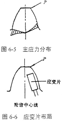 鼓形齒聯(lián)軸器內(nèi)外齒輪的嚙合齒對(duì)承受所作用的轉(zhuǎn)矩的作用,一般情況下,內(nèi)齒輪輪齒的剛度大于外齒輪輪齒的剛度,為了能更有效地反映應(yīng)變,工作應(yīng)變片貼于外齒輪輪齒的端面,溫度補(bǔ)償應(yīng)變片貼于不受力的相同材料上。輪齒的應(yīng)力狀態(tài)較復(fù)雜,在齒根處還存在應(yīng)力集中的情況下,但總的來說,對(duì)于一個(gè)齒,其齒根主應(yīng)力分布如圖6-5所示,因此考慮工作應(yīng)變片貼于輪齒中心線受拉應(yīng)力的一側(cè),靠近齒根邊緣處。這樣既不影響齒的嚙合,又能有效地反映接觸狀況,貼片布局如圖6-6所示。由于輪齒端面位置較為狹小,無法貼兩片應(yīng)變片,因此采用單臂工作方式測(cè)試。試件的選擇應(yīng)考慮加載量及貼片方便兩方面的因素,選擇模數(shù)較大的試件,便于貼片操作,但所需要加的載荷也較大,給操作帶來困難;反之則加載方便,但貼片較困難。綜合考慮上述兩方面的因素,并考慮能反映工業(yè)應(yīng)用的實(shí)際情況,本實(shí)驗(yàn)選用實(shí)際使用的鼓形齒聯(lián)軸器為試件,齒輪模數(shù)m=3mm,齒數(shù)z=56,其內(nèi)外齒加工精度分別為7級(jí)和6級(jí),材料均為ZG45鋼,熱處理為調(diào)質(zhì)處理,兩個(gè)鼓形齒輪分別為圓弧鼓度曲線和優(yōu)化鼓度曲線。