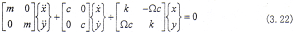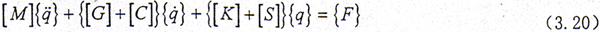 在式(3.20)中,[M],[C],[K]分別為整體系統(tǒng)的廣義質(zhì)量、阻尼和剛度矩陣,這三個(gè)矩陣是對(duì)稱陣;而[G]是陀螺力陣,[S]是廣義循環(huán)力(或稱之為廣義約束阻尼力)陣,這二個(gè)矩陣是反對(duì)稱陣;{F}為外激振力陣。
