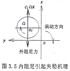 對(duì)于式(3.20)的穩(wěn)定性分析要復(fù)雜得多,形如式(3.14)的耗散函數(shù)首見(jiàn)于文獻(xiàn)[92]。美國(guó)學(xué)者Kane等在研究耗散的重力定向自旋衛(wèi)星穩(wěn)定性時(shí)發(fā)現(xiàn)的,與之相關(guān)的力被后來(lái)的學(xué)者稱之為約束阻尼,并沿用至今,而在轉(zhuǎn)子動(dòng)力學(xué)中則多被稱為循環(huán)力[93].如果在系統(tǒng)運(yùn)動(dòng)方程中沒(méi)有循環(huán)力陣[S],則系統(tǒng)的穩(wěn)定性可以利用著名的Kelvin-Tait-Chetaev定理來(lái)分析,但是當(dāng)[S]≠0時(shí),這個(gè)定理就不適用了。Mingori[94]、李俊峰等[95]對(duì)此作了專門的研究,給出了在某些特定條件下的判穩(wěn)方法。文獻(xiàn)[94]仍要求解一同階矩陣的特征值;而文獻(xiàn)[95]中的條件則要求det[G]≠0,因而式(3.20)不滿足,比較可行的方法是運(yùn)用Routh-Hurwitz法來(lái)判穩(wěn),但也只能解決低階系統(tǒng),對(duì)于高階系統(tǒng)只能進(jìn)行數(shù)值計(jì)算。一個(gè)比較簡(jiǎn)單的物理解釋是在式(3.16)和式(3.17)中,存在首促進(jìn)渦動(dòng)的耦合力(clΩx)和耦合力矩(caΩφ)項(xiàng)。下面以耦合力(clΩx)為例來(lái)加以說(shuō)明。設(shè)轉(zhuǎn)子的轉(zhuǎn)動(dòng)方向和渦動(dòng)方向如圖3.5所示,耦合力與軸的轉(zhuǎn)動(dòng)方向相同,并且隨轉(zhuǎn)子轉(zhuǎn)動(dòng)角速度Ω的增大而增大,在Ω高于某一極限值時(shí),這個(gè)耦合力會(huì)超過(guò)外阻尼使軸心產(chǎn)生一個(gè)與該力同向的加速度,這個(gè)加速度使軸心軌跡發(fā)散,即系統(tǒng)失穩(wěn)。