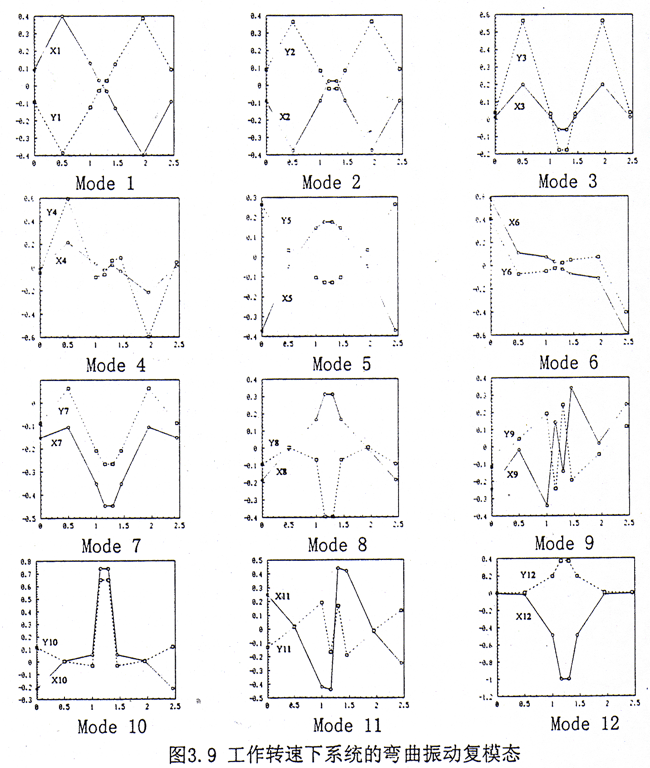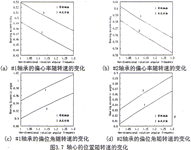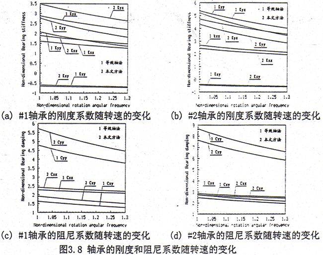 從以上的計算結果來看,用等效軸法計算軸承的軸心位置,#1軸承處的偏心率明顯偏小,偏位角偏大,而在#2軸承處則正相反。這表明采用等效軸法會使轉(zhuǎn)子的平衡位置產(chǎn)生較大的誤差,也預示著#1軸承和#2軸承之間負荷分配的變化。另外比較#1和#2軸承的結果,還可以看出,聯(lián)軸器的作用使得二個軸承的負荷分配趨于接近,而等效軸法從某種意義上講相當于二個轉(zhuǎn)子的直接對接,必將造成二軸承負荷分配不均,在工作轉(zhuǎn)速下各軸承處的負荷分配見表3.2,因此對軸承的受力來說這也正是采用齒輪聯(lián)軸器的優(yōu)點所在。從二軸承處的動特性來看,#1軸承的各項剛度和阻尼系數(shù)比等效軸法大,而#2軸承的各項剛度和阻尼系數(shù)則比等效軸法小,這歸根到底也是軸承負荷分配發(fā)生了變化的結果。如果采用單軸分析方法計算,以左側轉(zhuǎn)子為例,由于聯(lián)軸器的質(zhì)量與圓盤相比要小許多,系統(tǒng)近似為一對稱轉(zhuǎn)子系統(tǒng),則作用在#1和#2軸承上的負荷相差不大,因此二個軸承處的動特性系數(shù)也比較接近。由于軸承的靜、動特性發(fā)生了變化,因此勢必引起系統(tǒng)動態(tài)特性的變化。