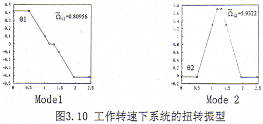 在ka=0.128不計內(nèi)阻尼時,工作轉(zhuǎn)速下系統(tǒng)的前12階彎曲振動復模態(tài)圖見圖3.9。從復模態(tài)圖上可以看出,在低階彎曲模態(tài)中,輪齒的變形是較小的,輪齒變形較大主要發(fā)生在高階模態(tài)中。這與實際情況比較接近,因為在實際的轉(zhuǎn)子系統(tǒng)中,輪齒的剛度一般比軸段的剛度要大許多,因此在低階的彎曲模態(tài)中,輪齒的變形體現(xiàn)不出來。系統(tǒng)前2階的扭轉(zhuǎn)振型如圖3.10所示。在前二階扭轉(zhuǎn)振型中輪齒變形也較小。