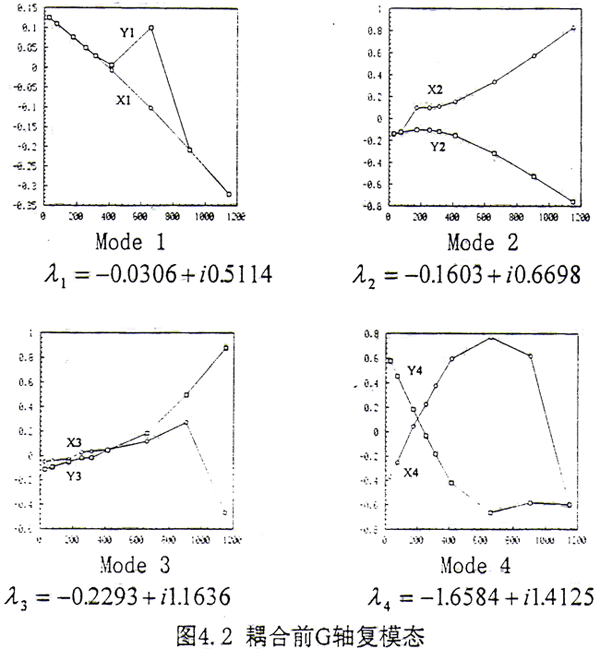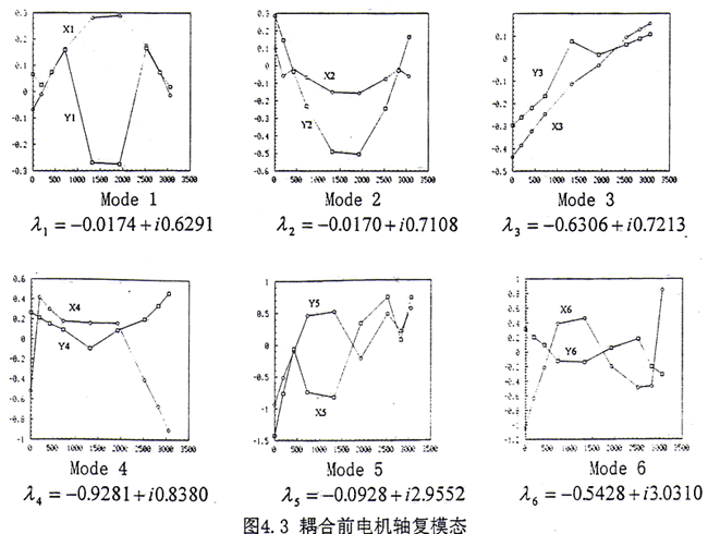 通過齒輪聯(lián)軸器耦合后的轉(zhuǎn)子系統(tǒng),在上述給定的轉(zhuǎn)速范圍內(nèi),共為12階模態(tài),如圖4.4所示,比耦合前多了2階。這表明耦合后在上述轉(zhuǎn)速范圍內(nèi)模態(tài)數(shù)目發(fā)生了變化。耦合系統(tǒng)的模態(tài)可以分為兩類:(1)第一類為耦合成分很小的振動,例如Mode1、Mode4、Mode7、Mode8,這4階幾乎完全表現(xiàn)為G軸的振動,電機(jī)軸的振動很小。但是從模態(tài)圖上來看又不能與耦合前單個G軸的4階模態(tài)相對應(yīng),主要表現(xiàn)為與齒輪聯(lián)軸器相連接的G軸的外伸端在耦合前上述4階的振動很大,而在耦合后振動受到很大的抑制,振動很小。從復(fù)特征值來看,無論是反應(yīng)系統(tǒng)衰減快慢的實部,還是反映系統(tǒng)自然振動頻率的虛部都有不小的變化。如果將上述4階對應(yīng)的復(fù)特征值作一比較,那么其中耦合后的虛部值總是大于耦合前的對應(yīng)值。其主要原因是在耦合后將G軸和電機(jī)軸作為一個整體系統(tǒng)來考慮,此時相當(dāng)于將電機(jī)軸看作是對G的一個約束,這一約束直接作用于外伸端,使得G軸外伸端的振動減小,同時使得G軸的自然頻率增大。因此傳統(tǒng)上在計算DH機(jī)組的動態(tài)特性時,強(qiáng)行將G軸和電機(jī)軸分開,而只考慮其中的G軸,僅從這4階模態(tài)和復(fù)特征值上進(jìn)行分析也會產(chǎn)生較大的偏差。(2)第二類為G軸和電機(jī)軸之間的耦合模態(tài),在這8階模態(tài)中G軸和電機(jī)軸的振動非常明顯,這表明如果將G軸和電機(jī)軸在齒輪聯(lián)軸器處分開處理,僅計算G軸的振動,而不考慮電機(jī)軸的影響,那么上述8階模態(tài)會全部被漏掉,因此這樣處理會丟失一些非常重要的低頻信息。在文獻(xiàn)[18]中,由于未考慮電機(jī)軸的作用,因此與電機(jī)軸有關(guān)的模態(tài)信息就不出現(xiàn)。如果從這8階復(fù)特征值前6階的數(shù)值來看,那么都能從耦合前電機(jī)軸的6階模態(tài)中找到,而且低階特征值的實部和虛部變化均不大。這說明如果僅分析電機(jī)軸的振動,那么將G軸忽略掉,倒能得到較好的近似。從直觀上看,將G軸與電機(jī)軸相比,其質(zhì)量和幾何參數(shù)要小許多。如果將G軸看成是電機(jī)軸的約束,那么這一約束比電機(jī)軸對G軸的約束自然要弱得多。因此從這一意義上來說G軸對電機(jī)軸的影響沒有電機(jī)軸對G軸的影響大。綜上所述,耦合后電機(jī)軸對G軸的影響較大,而G軸對電機(jī)軸的影響較小。在實際工程中,象DH這樣的機(jī)組曾發(fā)生電機(jī)振動過大的現(xiàn)象[9],因此如果不將G軸、電機(jī)軸和齒輪聯(lián)軸器作為整體一起進(jìn)行分析而在齒輪聯(lián)軸器處強(qiáng)行分開只分析G軸的振動就顯得極不合適。
