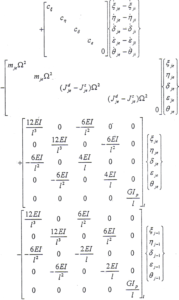 半齒輪聯(lián)軸器系統(tǒng)的動(dòng)能包括內(nèi)外齒輪的平動(dòng)動(dòng)能和轉(zhuǎn)動(dòng)動(dòng)能;彈性勢(shì)能包括左右軸段的彈性勢(shì)能和半齒輪聯(lián)軸器的彈性勢(shì)能;耗散函數(shù)包括內(nèi)外齒輪之間的橫向內(nèi)阻尼和轉(zhuǎn)角內(nèi)阻尼,由于扭轉(zhuǎn)內(nèi)阻尼較小可將其忽略,具體的分析過程可參見第三章3.2.2和3.2.3節(jié)。這樣取q=ξje,ηje,δje,εje,θje,ξji,ηji,δji,εji為廣義坐標(biāo),將以上的約束方程(5.26)式代入半齒輪聯(lián)軸器系統(tǒng)的動(dòng)能,勢(shì)能及耗散函數(shù)中,消去多余的變量θji,再由拉格朗日方程就可以得到在齒輪嚙合處的運(yùn)動(dòng)微分方程。由于推導(dǎo)過程比較冗長(zhǎng),在此僅列出最終的運(yùn)動(dòng)微分方程。對(duì)于小偏離情況,將其中的高階小量略去,則對(duì)于第j個(gè)結(jié)點(diǎn)(其中外齒輪下標(biāo)為e,內(nèi)齒套下標(biāo)為i)